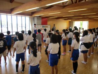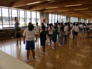 なかよしタイムに1年生と6年生が交流をしました。体育館でペアになり、ジャンケンを行いました。まだまだ暑い日が続き、外で遊ぶことができない日もありますが、体育館で楽しく活動することができました。 |