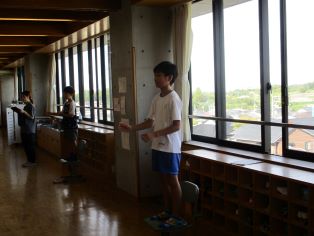 朝の時間にスマイルソングを行いました。学年ごとに集まって、今月の歌である「少年時代」を歌いました。素敵な歌が学校中に響きました。 |