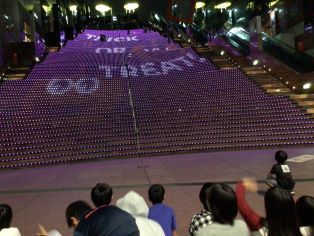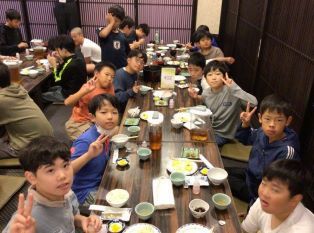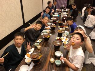 | 班別研修から旅館に戻り、元気に夕食を食べました。そのあと、京都駅に出かけ、夜景やプロジェクションマッピングを楽しみました。 |