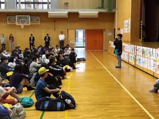 | 学校に帰ってきました。スローガンを意識して仲間と協力してきた二日間を振り返り、修学旅行でたくさんの思い出をつくれたことに感謝をしながら、締めくくりました。 |
