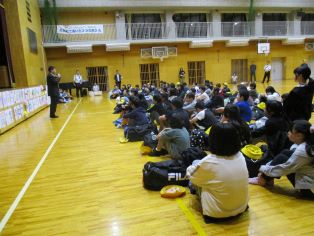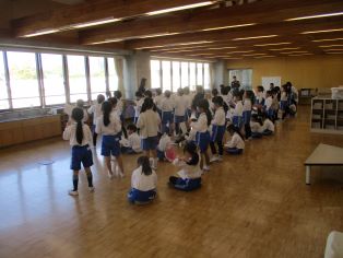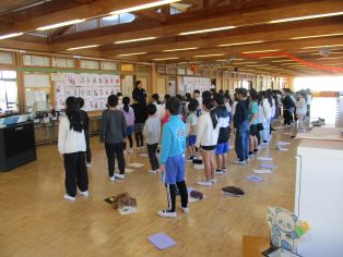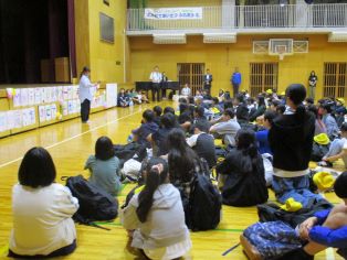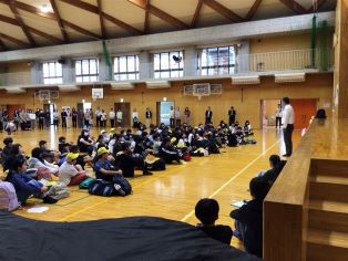 | 修学旅行1日目、体育館で出発式を行い、6年生が元気に修学旅行に出かけました。天気が心配ですが、素敵な二日間になるように、見送りに来た保護者の方と送り出しました。 |