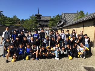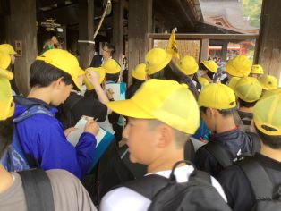 | 最後の訪問場所である法隆寺に到着しました。思った以上に暑く疲れもありましたが、ガイドさんの説明を熱心にメモしながら、充実した学びにすることができました。 |