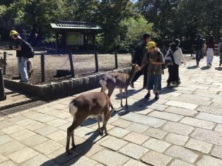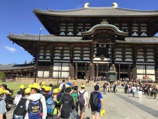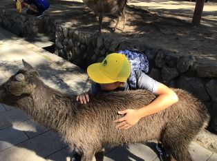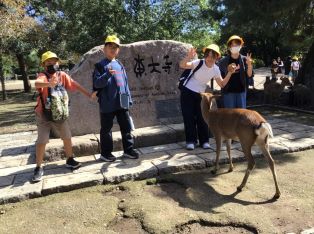 | 奈良公園に到着し、本物の大仏の大きさに圧倒されました。そのあと、奈良公園をグループでまわり、鹿たちを仲良くすることができました。 |