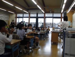 | 給食博士が来校され、5年生が食に関する授業を行いました。普段食べているご飯一杯にどれだけの米粒があるかクイズ形式で考え、食事に対する意識を高める機会になりました。 |