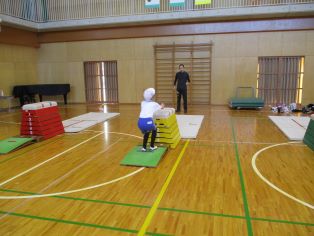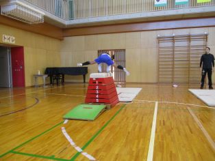 | 3年生の体育の授業では、とび箱を行っています。手をつく場所を奥の方にするなど、ポイントに気を付けながら何度も練習に取り組み、一段でも高く跳べるようにがんばっています。 |