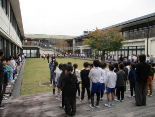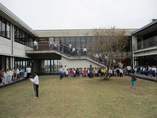 | 音楽委員会がスマイルソングを行いました。全校で中庭に集まり、校歌と「世界に一つだけの花」を歌いました。歌声が中庭全体に響き、とてもすてきな時間になりました。 |