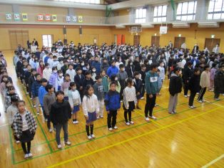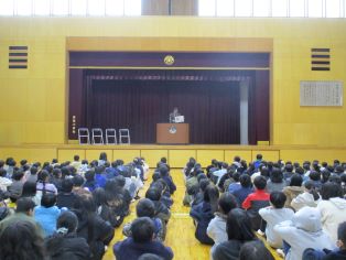 | 冬休み前集会を行いました。代表者が今年一年がんばったことや来年に目標について話をしました。今年一年を振り返るよいふしめになりました。 |
