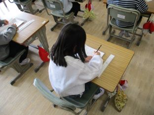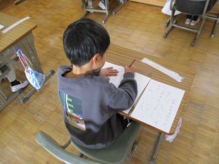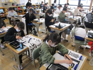 | 校内書き初め大会を行いました。1・2年生は硬筆、3〜6年生は毛筆で、手本をしっかり見ながら、一画一画、丁寧に書いていました。静かで落ち着いた雰囲気の中、集中して取り組む姿が見られました。 |