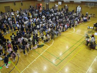 | 明日の大繩大会に向けて、なかよしタイムに全校で練習を行いました。どのクラスも声をかけながら、よりたくさん跳べるようにがんばっていました。 |