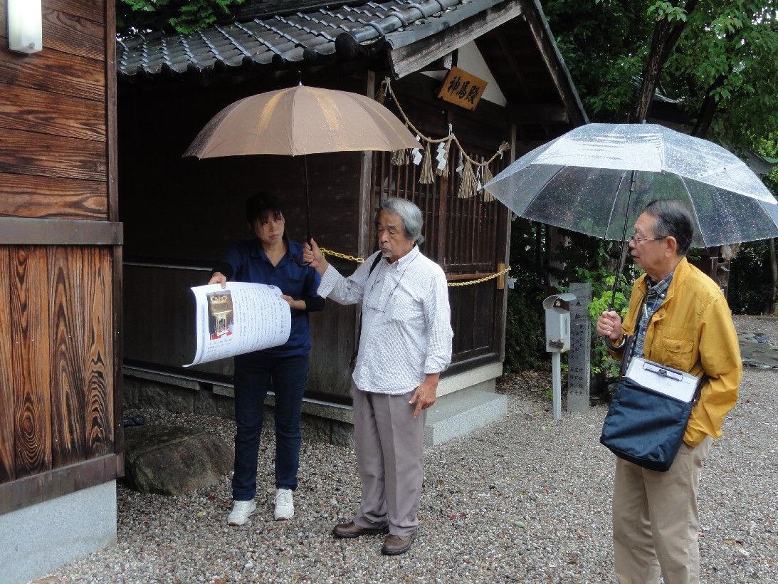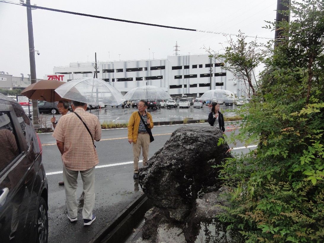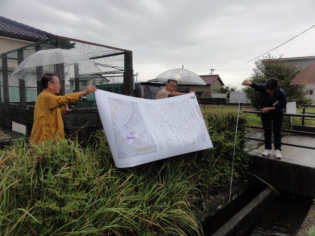 雨天の中、本年度に設置する看板の配置・サイズ確認のために、予定地を視察してきました。