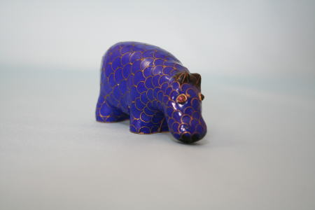 濃紺のウロコ模様のカバ。目に宝石が入っている。デパート1階の宝石売り場を通り抜ける時に発見。宝石売り場を通り抜ける居心地の悪さと、何かいないかなという思いの両方をかかえて早足で歩いていると、何かが私を呼び止めた感じがした。足を止めて見ると、売り物のようでもあり、飾りでもあるような2つの置物があった。カバとサイだった。サイも買おうか迷ったが、カバだけにした。