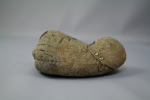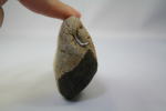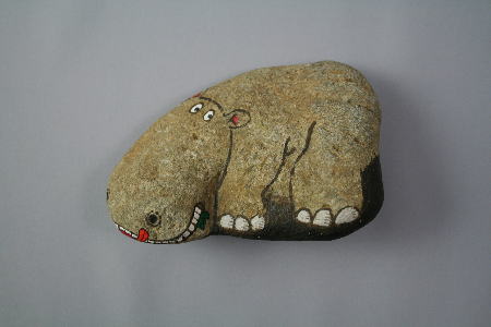 河原に落ちているような石の形を利用して、カバが描かれている。左側のふくらみが、ちょうど顔になっている。下の方の不要な部分は、黒く塗りつぶしてある。裏には「ランチかば」と書かれ、朱の印が押してある。すべて手書き。口の端に緑の草が描かれ、カバが食事中らしい。