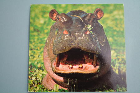 緑色の草の中でカバの顔がアップになっている。色の対比がきれい。耳の形だけでなく、うぶ毛までが写っている。また、口の中の様子、歯の形がよく分かる。これはAさんからの航空便の年賀状。