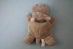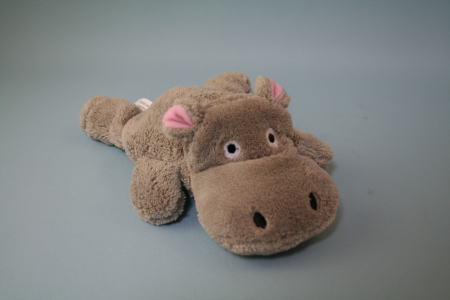 お風呂でも使えるぬいぐるみ。目と鼻の形が のほほんとした感じ。小さな子どもが喜びそうな目である。グレーの体とピンクの耳の対比がきれいだ。この耳の形と色が、カバらしさを出している。