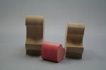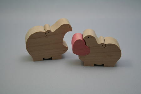 木製。糸鋸で切ったカバ2頭が向き合って、ピンクのハートを支えている。カバにハートが似合うかどうかは、意見の分かれるところだと思うが、淡い色のピンクはとてもきれいだ。