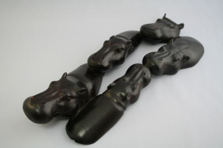 ルワンダのブースで発見。大きくて重くて堅い。とてもていねいに作られていて、5頭のそれぞれが、豊かでやさしい表情をしていた。カバの仏像群のよう。
