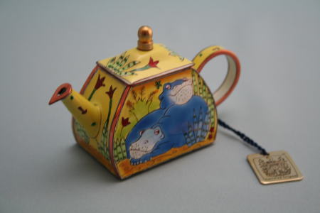 銀座の入ったことのない高級店でうろうろ。しばらく眺めていたら店員さんが近寄ってきた。そのタイミングが絶妙だった。ミニチュアのポットであって、実際には使えないこと、シリアルナンバがうってあること(ちなみにこれはC106)を教わった。七宝焼きの表面に、のんびりしたカバが寝そべっている。