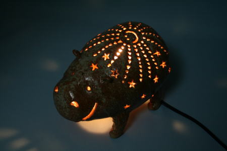 ほとほと困っていたら、家族から「ライトで光るおもしろカバがいる」と教えられた。1年ほど前、おしゃれな創作陶器店に素敵なゾウのライトがあった。店主の方と「カバがほしい」と話をしていたら、作者の方に連絡して作っていただけることになった。送られてきたカバは写真のようにとてもかわいかったが、星が多い派手さがちょっと照れくさくて、ライトとしては使わず、しまってあった。