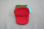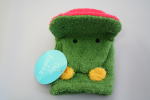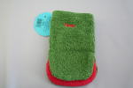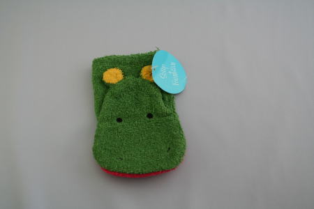 グリーンのカバ。黄色い耳と赤い口がきれい。タオル地がやわらかい。幼児の手が入るくらいの大きさ。大と小があり、小を手に入れた。お風呂に入って、この人形で遊び、そのあと石けんをつけて体を洗うようにできている。
