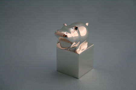 銀色のペーパーウェイト、つまり文鎮。動物シリーズには、ゾウ、キリン、サイなどがいる。