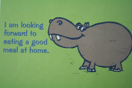 「おうちでおいしいごちそうを食べたいな」と言っているようだ。なぜか絵はがきには英語のメッセージが多く、カバが言っていることは、メッセージ性が強くない場合が多いようだ。