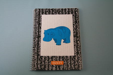 エジプトのブルーヒッポのついたノート。淡い色の象形文字の書かれたページの下の方に青いカバがいる。