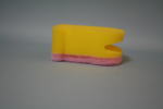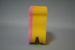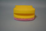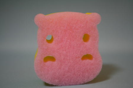 スポンジ製の食器洗い。「横面の切り込みで、お皿を挟んで洗える かわいいカバの食器洗いスポンジです」と袋に書いてあった。スポンジに目と鼻をあけ、耳をつけて顔の輪郭を描くだけで、楽しくなる。