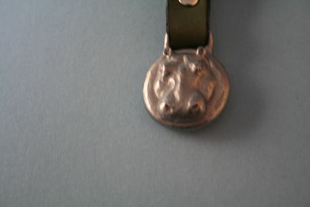 村中保彦作。カバの顔を正面からとらえたキーホルダー。裏に「保」という作者名が彫られている。
