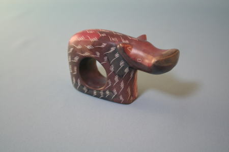 ソープストーン製。口がスプーンのように広がっているため、ケニアかその周辺の国で作られたものと思われる。胴体に丸く空洞があるのが特徴だ。Sさんによると、食卓でナプキンを丸めて入れておくものらしい。あるいは、レストランで伝票を入れることができるかもしれない。
