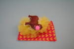 どこにでもいそうなプラスチックの口あけカバ。ピンクのボールをくわえている。背景に網状の黄色のレース地。裏にピンがあってブローチになっている。色がきれい。