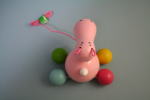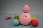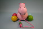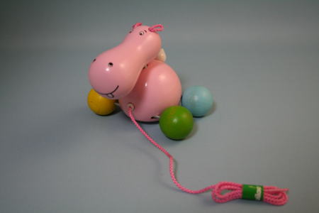 木製カバの引き車。ひょうたん型の顔、ピンクの胴、黄、緑、青、赤の足、白いシッポ。全体に丸みがあって、楽しい感じがする。