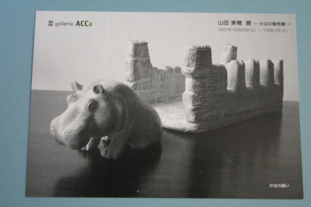 彫刻家の山田実穂さんから、「東京で、小さな個展を予定しています」と、案内ハガキをいただいた。右下には、「カバの囲い」と書いてある。