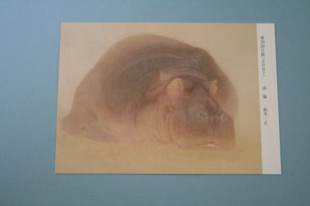 名古屋で開かれていた第39回日展の絵葉書。鈴木一正さんの「淡陽」という作品。やわらかな日差しの下で、カバがうっすらと目を開けて横になっている。大きな岩のように存在感があるカバだ。淡い色が素敵だ。