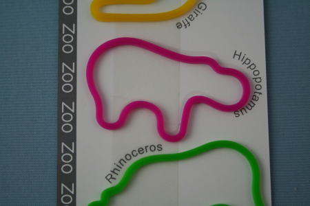 動物の形をした輪ゴム。丸みのある顔がカバとすぐ分かった。他にダチョウ、ゾウ、カンガルー、キリン、サイがいる。伸ばせば普通の輪ゴムとして使えるが、元に戻すとしっかりとカバになる。輪ゴムが窮屈な思いをしていないか、ちょっと心配。