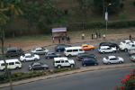 車はシートが固く、未舗装の道も全力で走り、かなり揺れたが、夕方の町の景色をゆっくり眺めることができた。人々が歩きながら挨拶を交わしていた。懐かしい景色を見るような感じがした。右の写真はホテルから見た、乗り合いバスを待つ人々。
