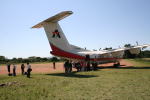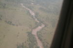Wilson空港(写真左)から小型機で西へ1時間、マラ川(中)を見ながら、マサイ・マラ自然保護区のMara-Ngerende空港(右)に飛んだ。小さなプロペラ機であることは事前に知っていたが、着いた 「空港」が小さな「草原」であることに驚いた。このあたりでは、ホテルごとに空港があり、乗り合いバスの停留所のように、飛行機が順に止まっていく、とのこと。