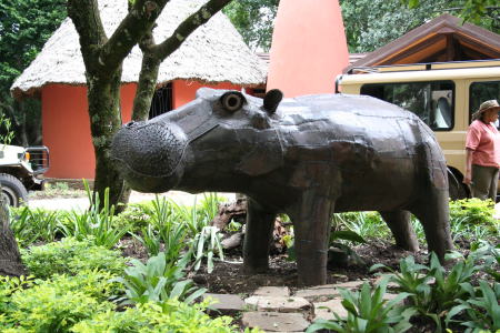 ケニア。ナイロビから飛行機で1時間。マサイマラ国定公園のホテル玄関前。 Kiko Mwitiki作、金属製。2m。