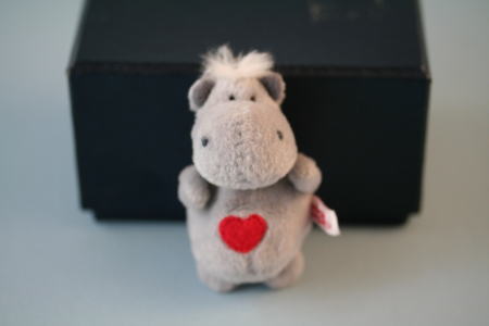 身長7pのぬいぐるみ。ふっくらとした顔、赤いハートが印象的。キーホルダーと思われるが、携帯のストラップとしても使えそう。Kさんのドイツ出張のおみやげ。出張・旅行のたびに、貴重なカバ情報をいただいている。
