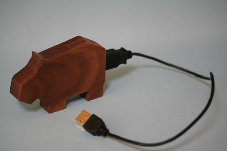 カバの形をしたUSBメモリー。ANIMAL USB Flash Drive。木目がきれい。余分な線をすべて除いたよう。パソコンとは、ケーブルでつなぐ。他に、イヌ、ブタ、ゾウ、アヒルのものがあるとのこと。