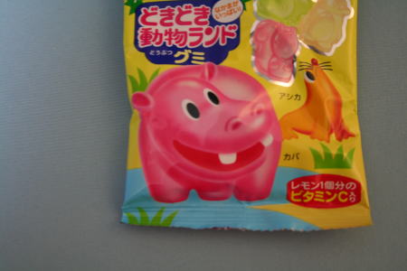カンロ社製の「どきどき動物ランド」というグミ。袋には、「なかまが いっぱい」「ぜんぶで12ひきのなかまがはいっているよ