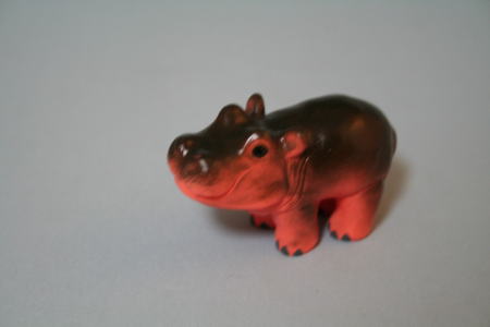 陶器製の子カバ。顔の比率が大きい感じがするが、目と耳がはっきりしていて、存在感がある。しっかりした作りで、色がきれい。