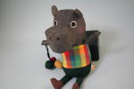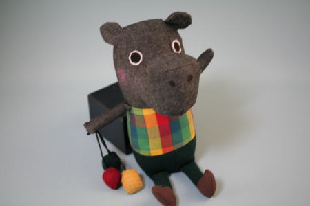 デニム地のカバの立体。大きな目、鼻が印象的だ。立本倫子さん作の「アニーのちいさな汽車」という絵本に登場するキャラクターがぬいぐるみとなった。絵本のストーリーは、コグマのアニーがおもちゃの汽車に乗って、カバなど、いろいろな動物と出会うというもの。