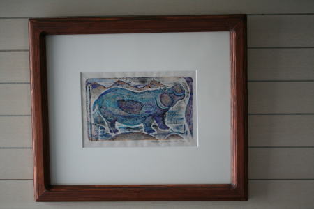 彫刻家の山田実穂さんの「Hippo」というコラグラフの作品。「コラグラフとは、コラージュ(主に紙を切り張りして作った画面)を版として摺った版画です。紙の凹凸や材質感をそのまま写し取るきわめて単純な技法ですが、私の性に合っているようで、制作中はとても楽しいです」とある(『かばづくりの日記』芸術新聞社,2008)。
