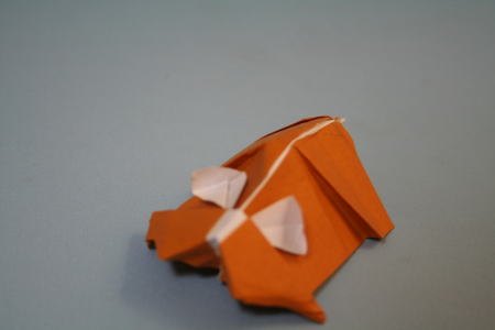 A病院(のちに、リハビリ病院に転院)では、リハビリを兼ねて、スタッフのNiさんと折り紙を作ることになった。しかし私は、そのむずかしさについて行けず、Niさんがほとんどを作られた。これはイノシシかイヌに似ていたが、丸く改良すると素敵なカバに変身するような気がした。