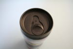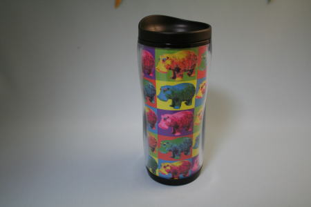 エジプトのブルーヒッポを現代風にデザインした旅行用マグカップ。大きめのカップに、色違いのカバのイラストが縦横に並んでいる。