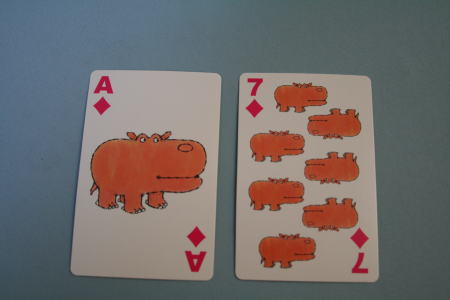 カバのトランプ。ダイヤがカバになっている。デザインがとても抽象化されているが、カバらしさが失なわれていない。J、Q、Kでは、カバが空を飛んでいたり、泳いでいたりする。他にスペードはゾウ、ハートはカメ、三つ葉はワニとなっている。