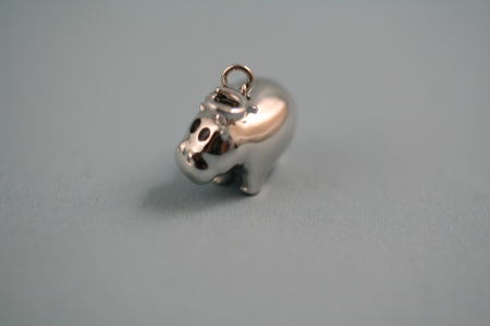 指の先に乗るような大きさの銀のカバ。目の周りが黒いのがかわいい。あるいは目そのものが黒いのかもしれない。紺色の布の袋に入っていて、AGATHAと書かれている。
