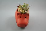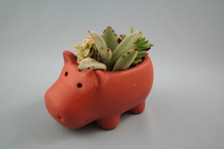 カバの形の鉢にいろいろな多肉植物が植えられている。心なごむ感じがする。