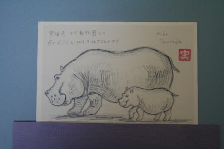 彫刻家の山田実穂さんからカバの年賀状をいただいた。「愛媛県とべ動物園にて/母かばミミと2011.7.24生まれのユイ」という説明がある。「四国のかば親子に会ってきました」とのこと。(2007年の年賀状はこちら)