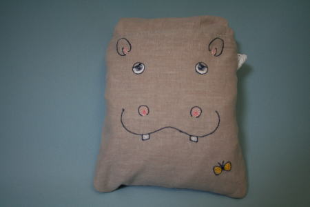 袋に描かれたカバ。耳、目、鼻、歯が、刺繍で、これまで見たことがない描き方で、かわいい。Un amiと刺繍がしてあった。